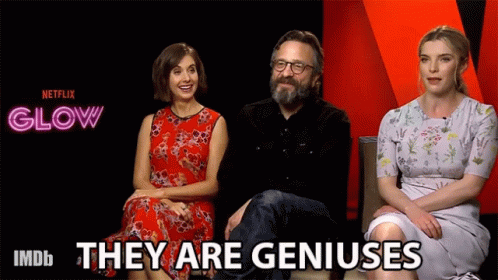 Betty Gilpin, Marc Maron, and Lison Brie sit for an interview with the caption 'They Are Geniuses'.