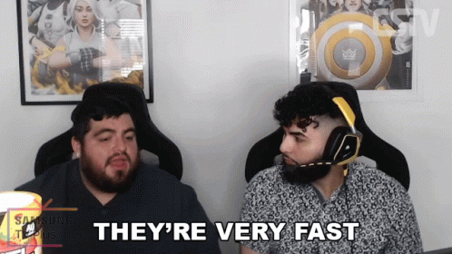 Two men react, one stating 'They're very fast' while wearing a headset, likely during a gaming event.