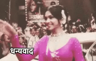 Deepika Padukone from Om Shanti Om waves to a crowd, with 'Thank you' (Dhanyawad) text.
