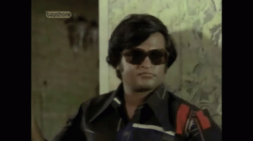 Rajinikanth portrays an emotional moment, taking off his sunglasses in the classic film Thillu Mullu.