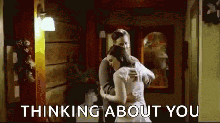 Ian and Erin Krakow share a tender hug in a hallway, with 'Thinking About You' displayed on screen.