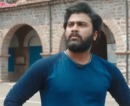 Actor Sharwanand looks thoughtful and confused, standing in a blue shirt against a stone building with arches.
