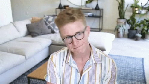 Tyler Oakley, wearing glasses, sits in a living room, deep in thought and considering options.