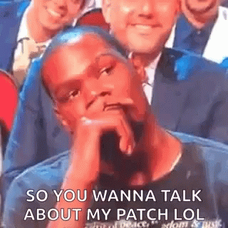 A man with a thoughtful expression, hand on chin, reacting to 'SO YOU WANNA TALK ABOUT MY PATCH LOL'.