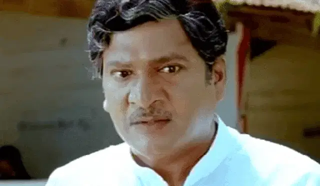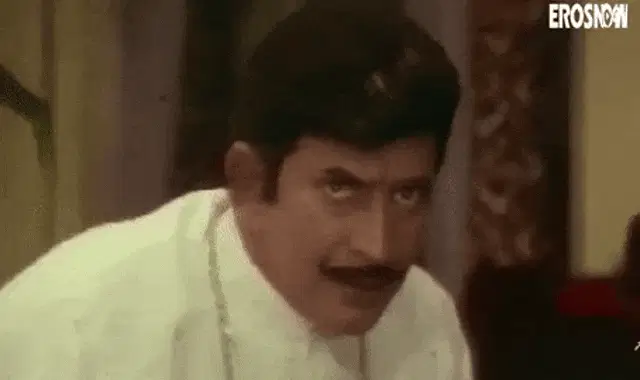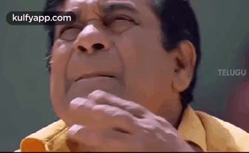 A man in a yellow shirt makes a funny, deeply thoughtful expression with his eyes closed and hand near his mouth.