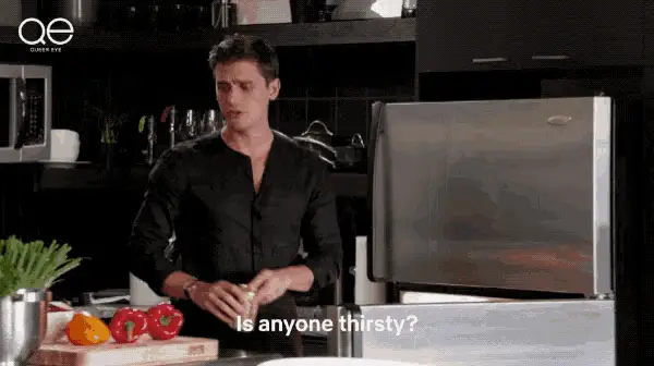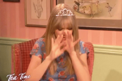 Taylor Swift wearing a tiara, covering her face, as '#THIRSTY' text appears during 'Tea Time'.