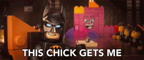 Lego Batman reacts to a pink Lego character, saying 'This chick gets me' in a humorous moment from The Lego Movie.