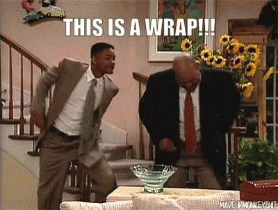Will Smith and a man in suits dance energetically in a living room, celebrating with 'This Is A Wrap!' caption.