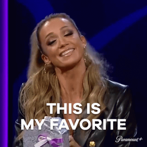 Kate Abdo smiles, holding a gift box and saying "This Is My Favorite" on Paramount+.