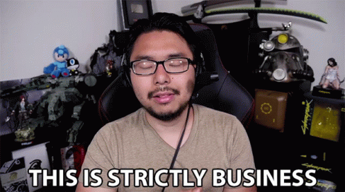 Yong Yea, wearing glasses and headphones, declares 'This is strictly business' in a video about work and profits.