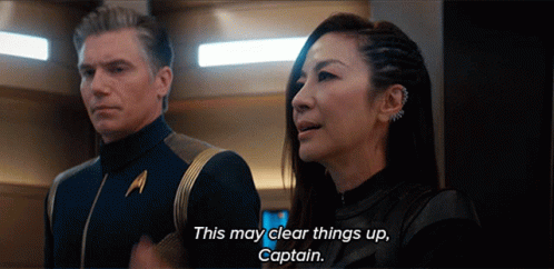 Michelle Yeoh as Emperor Philippa Georgiou tells Anson Mount as Captain Pike, "This may clear things up, Captain."