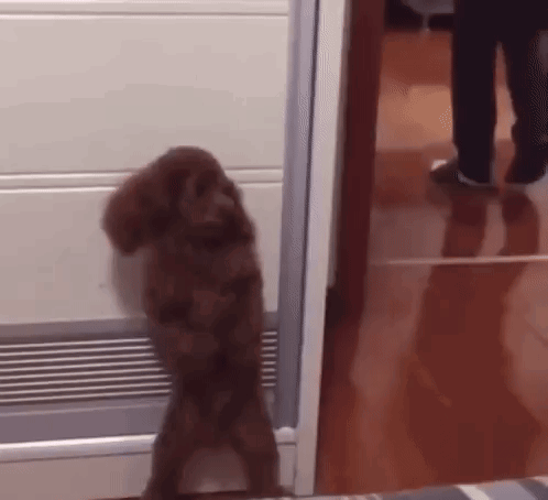 Rexx the dog stands on its hind legs, peeking around a door frame, seemingly hiding or observing its surroundings.