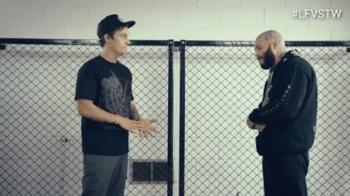 Two men in a cage-like setting, one gesturing to explain a 'tall size' to the other.