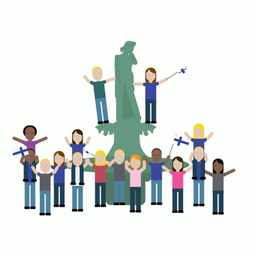 Cartoon people celebrate Finland with flags around a statue, embodying the spirit of Thisisfinland.