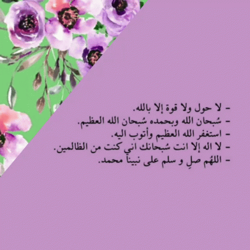 A beautiful image featuring Islamic invocations (dhikr) in Arabic text on a green background with purple flowers, offering spiritual reflection.