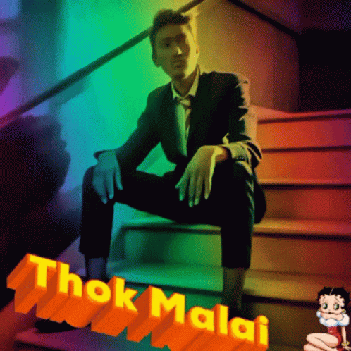 Man in a suit sits on colorful stairs with 'Thok Malai' text overlay and Betty Boop character.