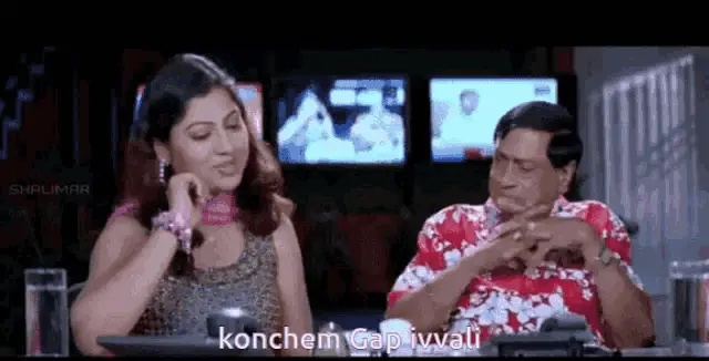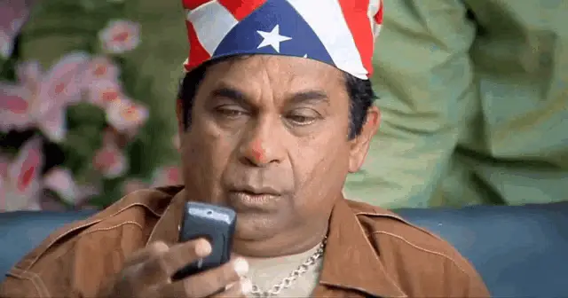 Chiranjeevi in a blue shirt and sunglasses, animatedly talking to an older woman in a comedic scene.