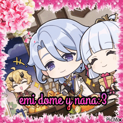 A vibrant image featuring anime characters Thoma and Ayato, alongside Ayaka, Emi, Dome, and Nana.