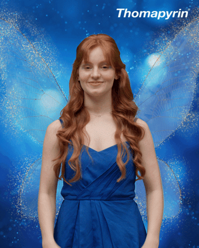 A woman with red hair, wearing a blue dress, gives two thumbs up for Thomapyrin.