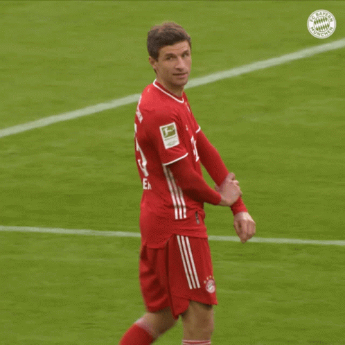 Thomas Mueller (Thomas Muller) in his FC Bayern Munich jersey on the football field, adjusting his sleeve.