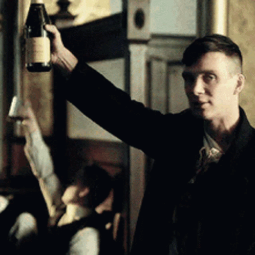 Thomas Shelby raises a champagne bottle in a celebratory toast, surrounded by others.