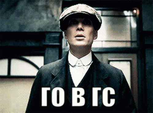 Thomas Shelby from Peaky Blinders looking up, with Russian text 'ГО В ГС' displayed as a meme.