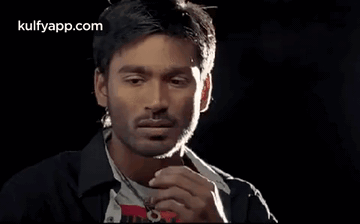 Indian actor Dhanush in a close-up shot, appearing thoughtful and pensive in a dimly lit setting.