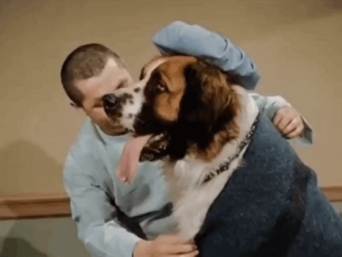 Curly of the Three Stooges with a large dog, reacting to its hiccup with "Gesundheit!".