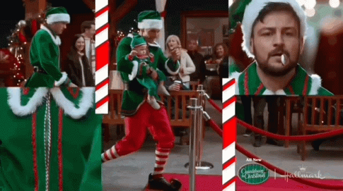 Tyler Hynes, Andrew Walker, and Paul Campbell in elf costumes, one holding a baby elf, from Three Wisemen And A Baby.