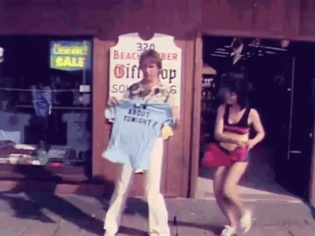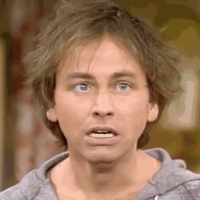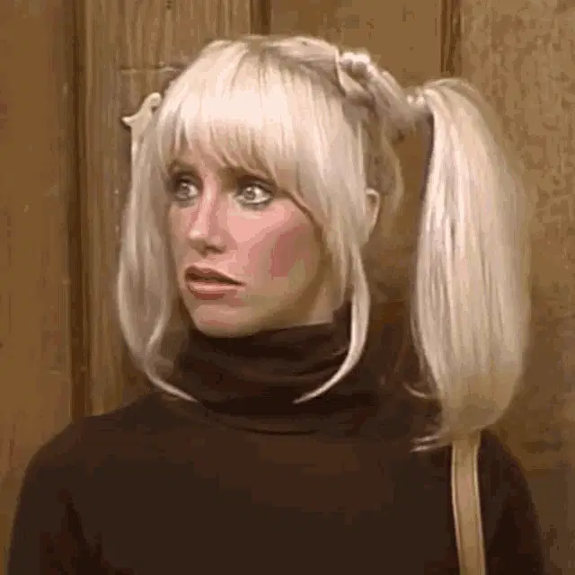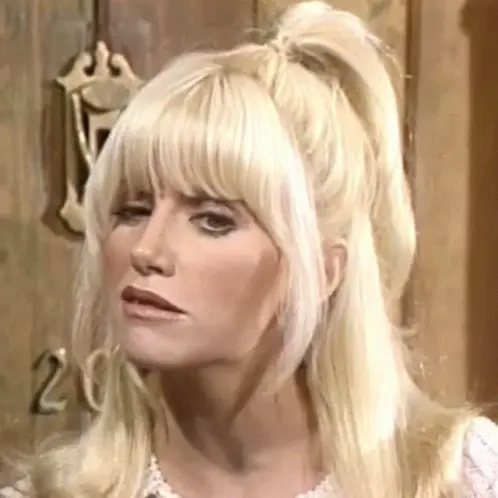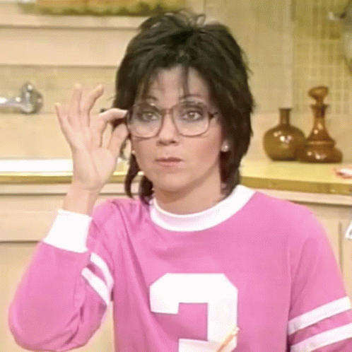 Joyce De Witt as Janet Wood from Three's Company, adjusting her glasses in the kitchen set.