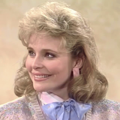 Priscilla Barnes as Terri Alden from Three's Company, smiling in a blue bow tie and sweater.