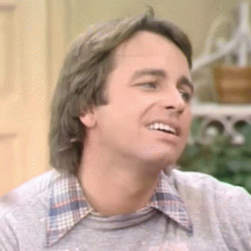 John Ritter as Jack Tripper from Three's Company, smiling and looking around.