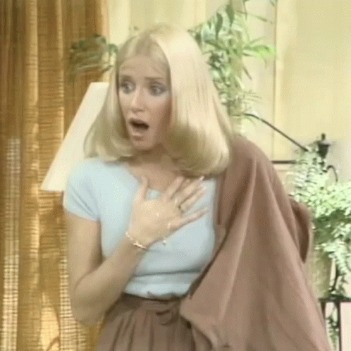 Suzanne Somers as Chrissy Snow from Three's Company reacts with a surprised expression, hand on her chest.