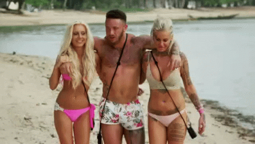 A man and two women in bikinis walk along a tropical beach, enjoying a hot threesome.