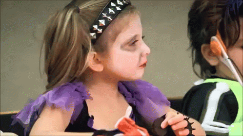A little girl in a studded headband and purple top reacts as if she's about to throw up.