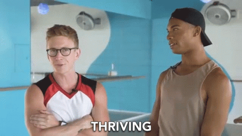 Tyler Oakley and another man standing with arms crossed, with the word 'THRIVING' displayed.