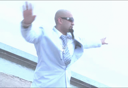 Man in white coat with arms outstretched, performing Thugpun Bhangra dance.