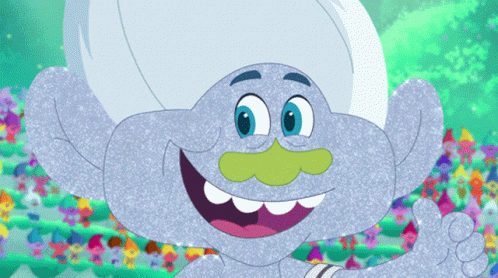 Guy Diamond from DreamWorks Trolls gives a cheerful thumbs up, sparkling with a big smile and blue eyes.