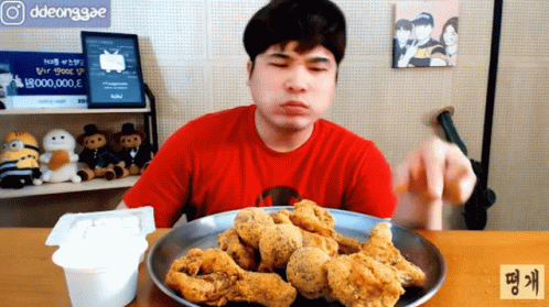 Ddeonggaeddeong gives a thumbs up for delicious fried chicken during a mukbang.