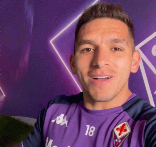 Lucas Torreira, wearing a purple Fiorentina jersey with number 18, smiles and gives a thumbs up.