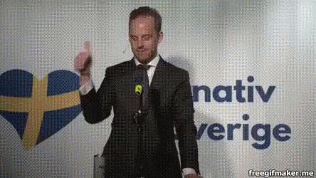 Gustav Kasselstrand gives a thumbs up gesture during a speech for Alternativ För Sverige.