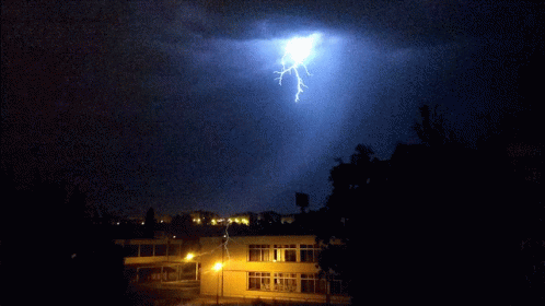 A powerful lightning bolt illuminates the dark night sky above a building during a thunderstorm in Sacavém.