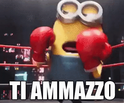 A Minion wearing red boxing gloves in a boxing ring declares 'TI AMMAZZO' (I'll kill you).
