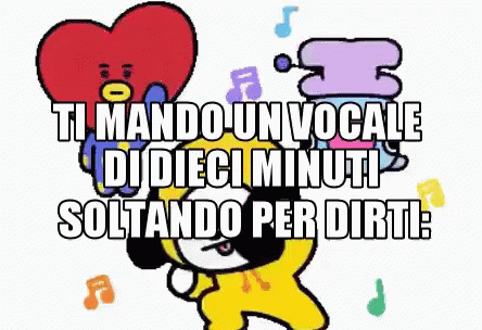 Animated BT21 characters with Italian meme text: "I'm sending you a ten-minute voice message just to tell you: Thegiornalisti Felicità Puttana."