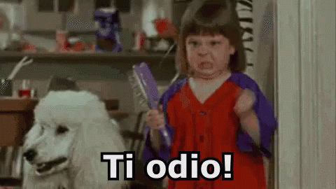 Angry child yells 'Ti odio!' (I hate you!) with a furious expression, a white dog nearby.
