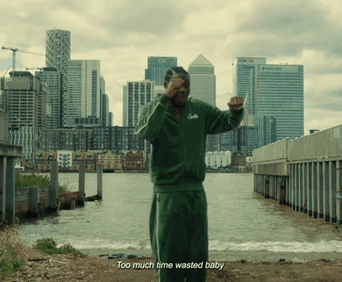 Tiakola Dave dancing in a green tracksuit by the water with a city skyline in the background.