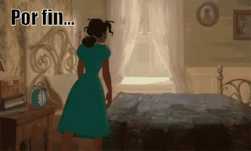 Tiana from The Princess and the Frog collapses onto her bed, exhausted and ready for sleep.