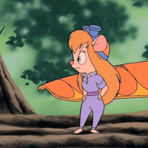 Gadget Hackwrench from Chip 'n Dale Rescue Rangers stands on a branch, looking annoyed.