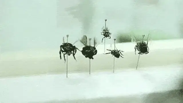 A cartoon bee with swirly eyes, wearing a bow tie, appears hypnotized and starts to fly. From Tic Et Tac Rangers Du Risque.