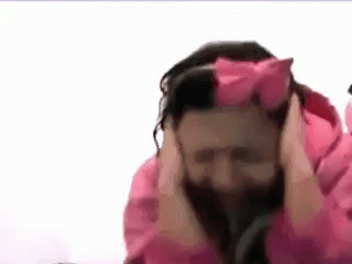 Tidinha covers their ears with a distressed expression, wearing a pink bow and a pink jacket.
